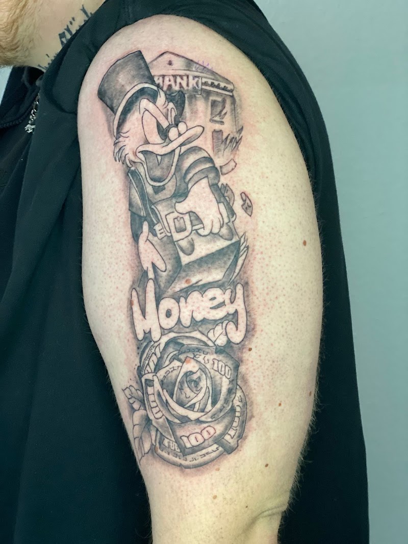 Dagobert Duck met geldroos en 'Money' tekst op bovenarm.