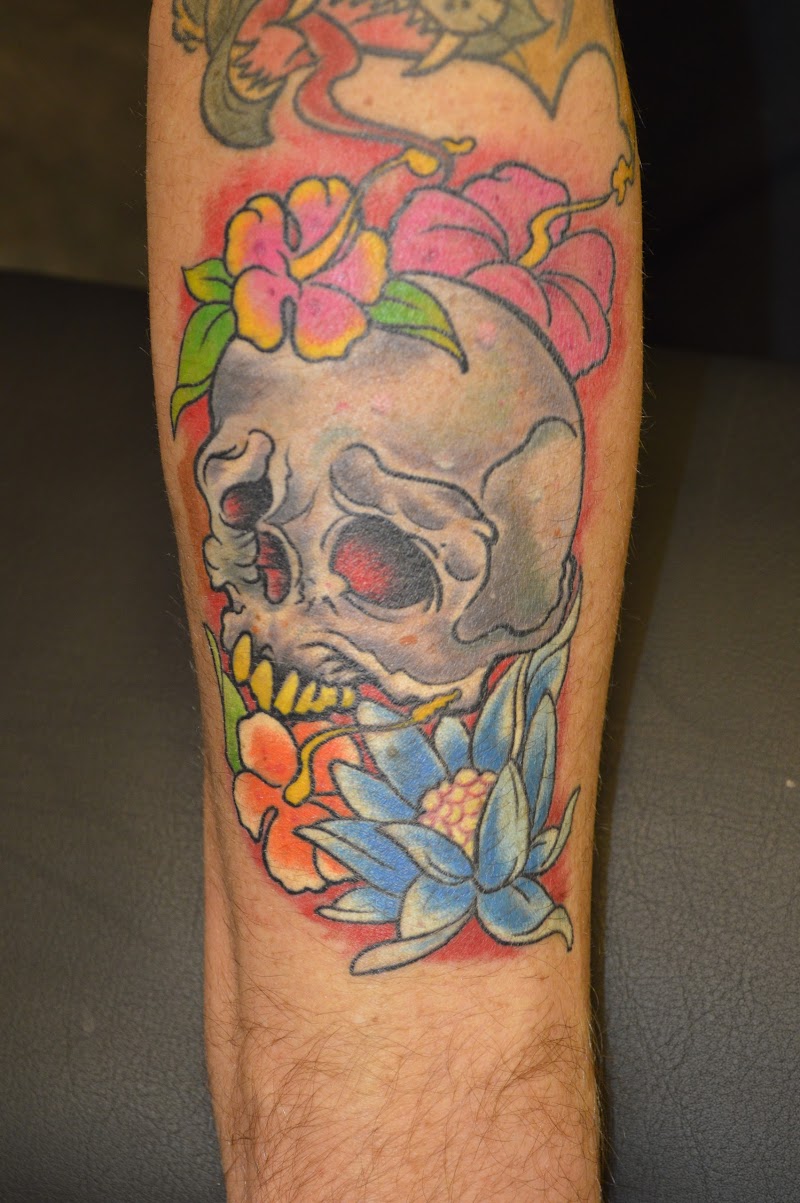 Neo-traditionele schedel met hibiscus en lotus bloemen op onderbeen.