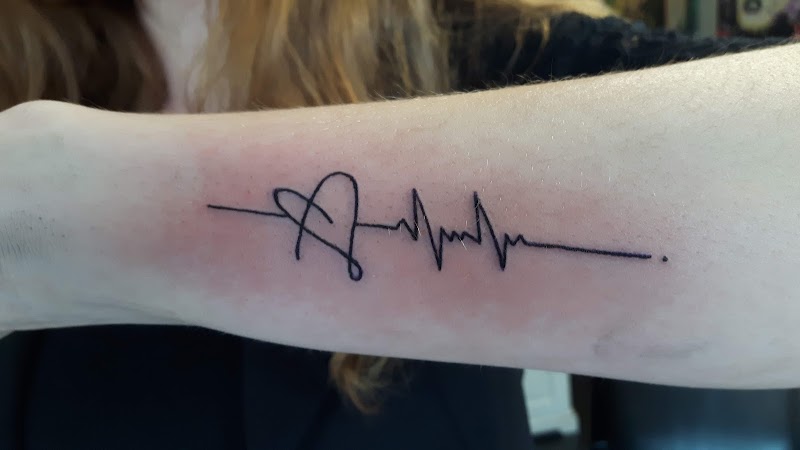 Minimalistische hartslag en hart tattoo op onderarm.