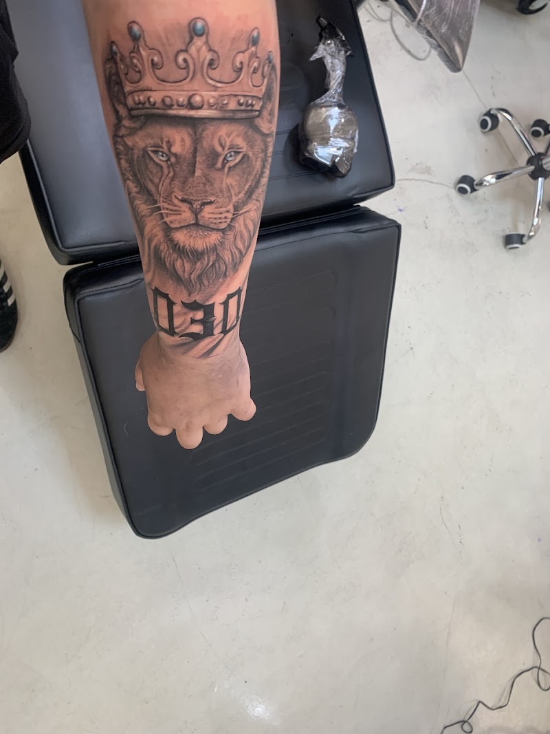 Realistische leeuw met kroon en '030' tekst op onderarm.
