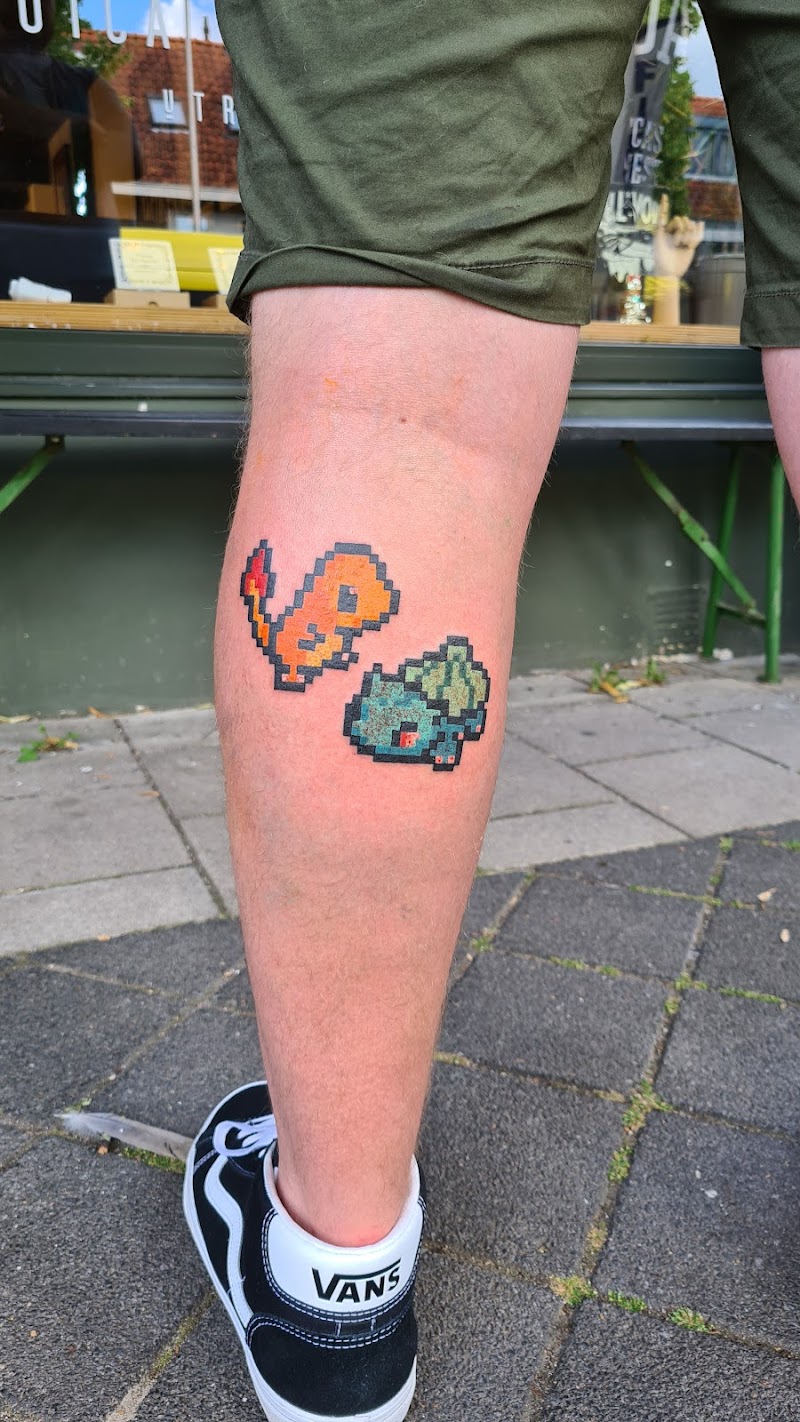 Pixel art Charmander en Bulbasaur op onderbeen.