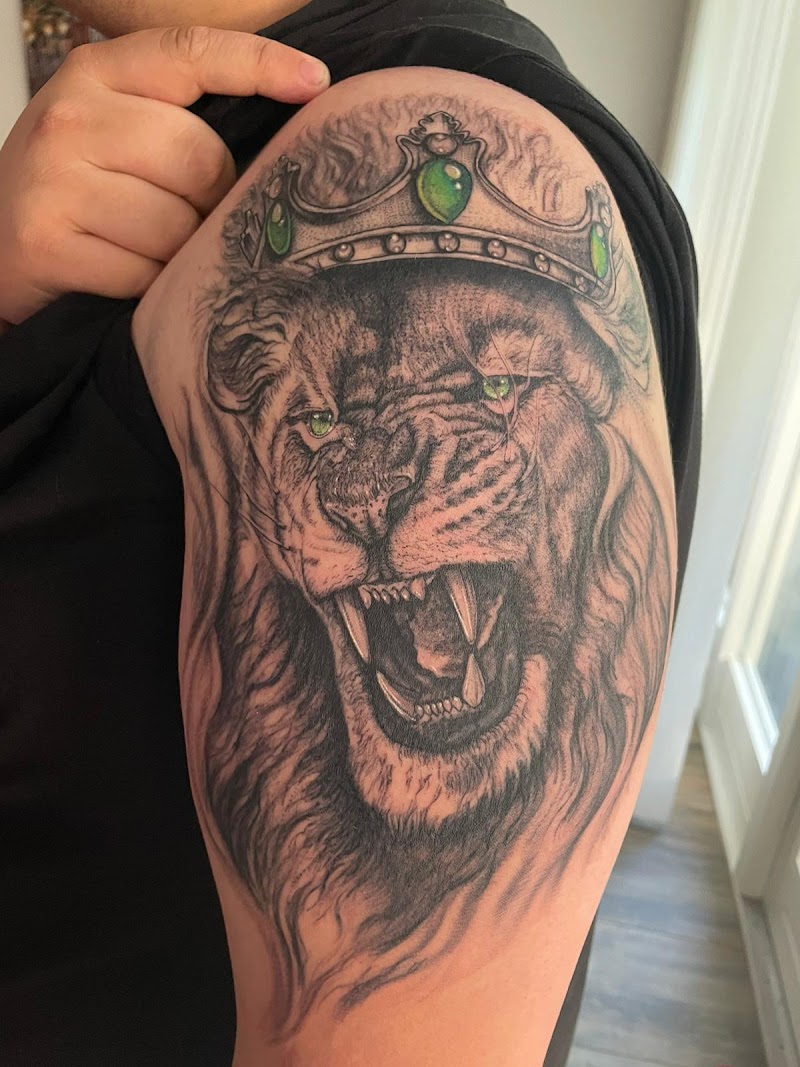 Realistische leeuw met kroon en groene ogen op bovenarm.