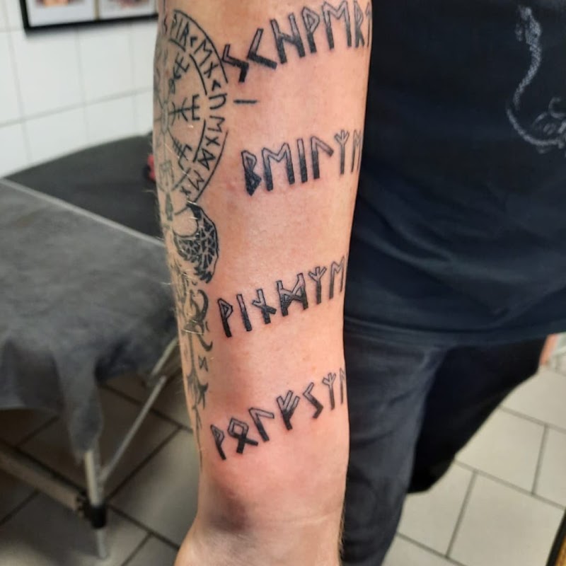 Zwart-wit runen en Vegvísir kompas op onderarm.