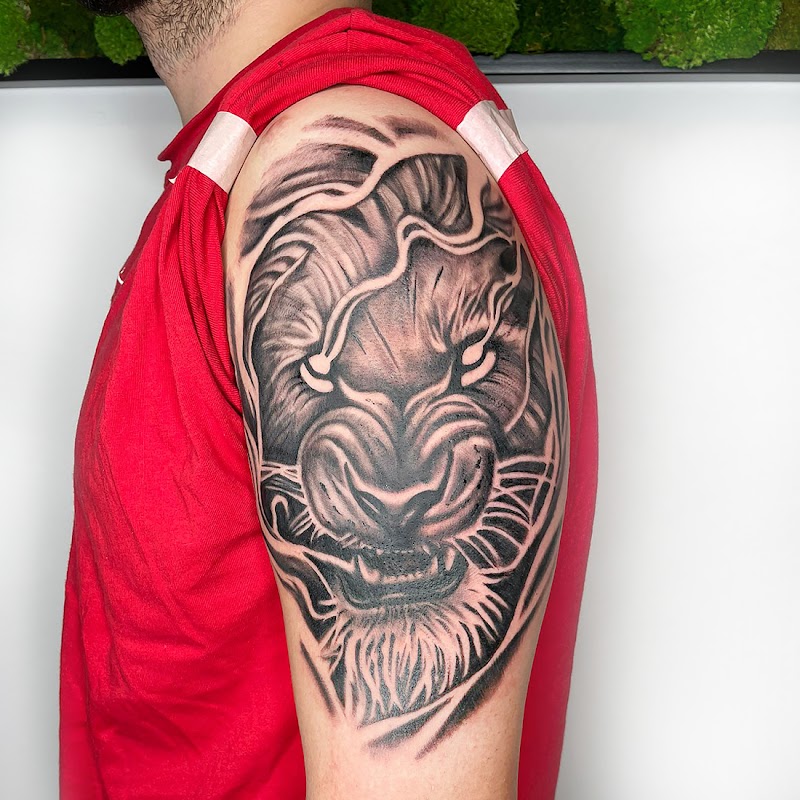 Zwart-wit leeuwenkop tattoo met witte ogen op bovenarm.