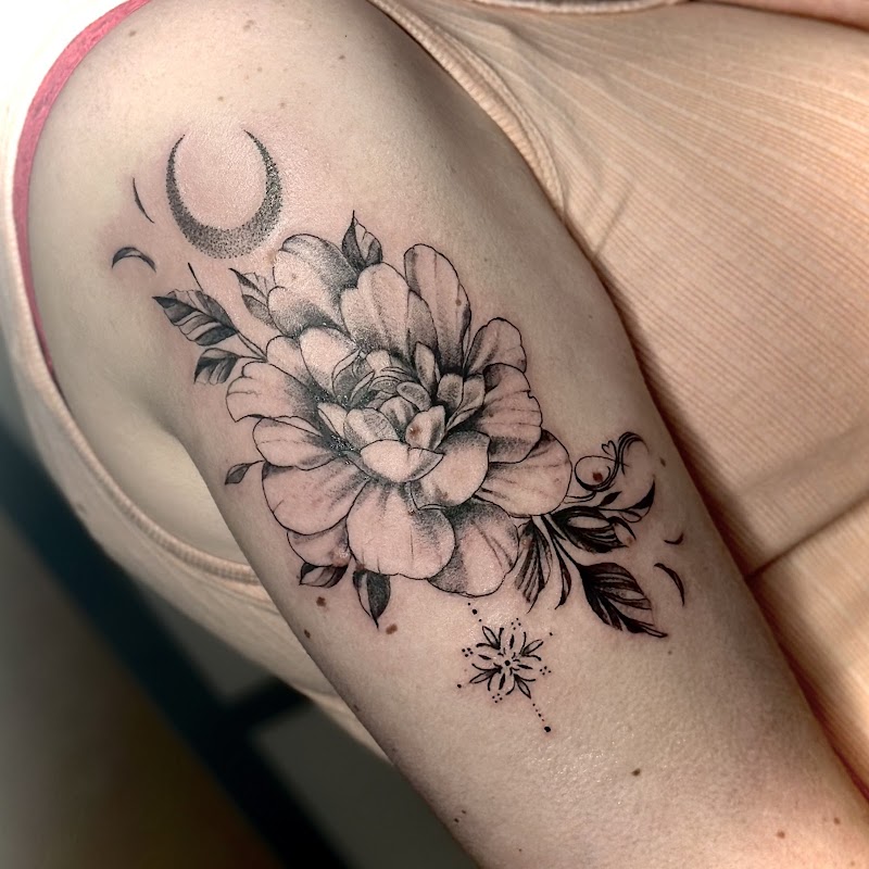 Zwart-wit tatoeage van een pioenroos met een halve maan en ster op de bovenarm.