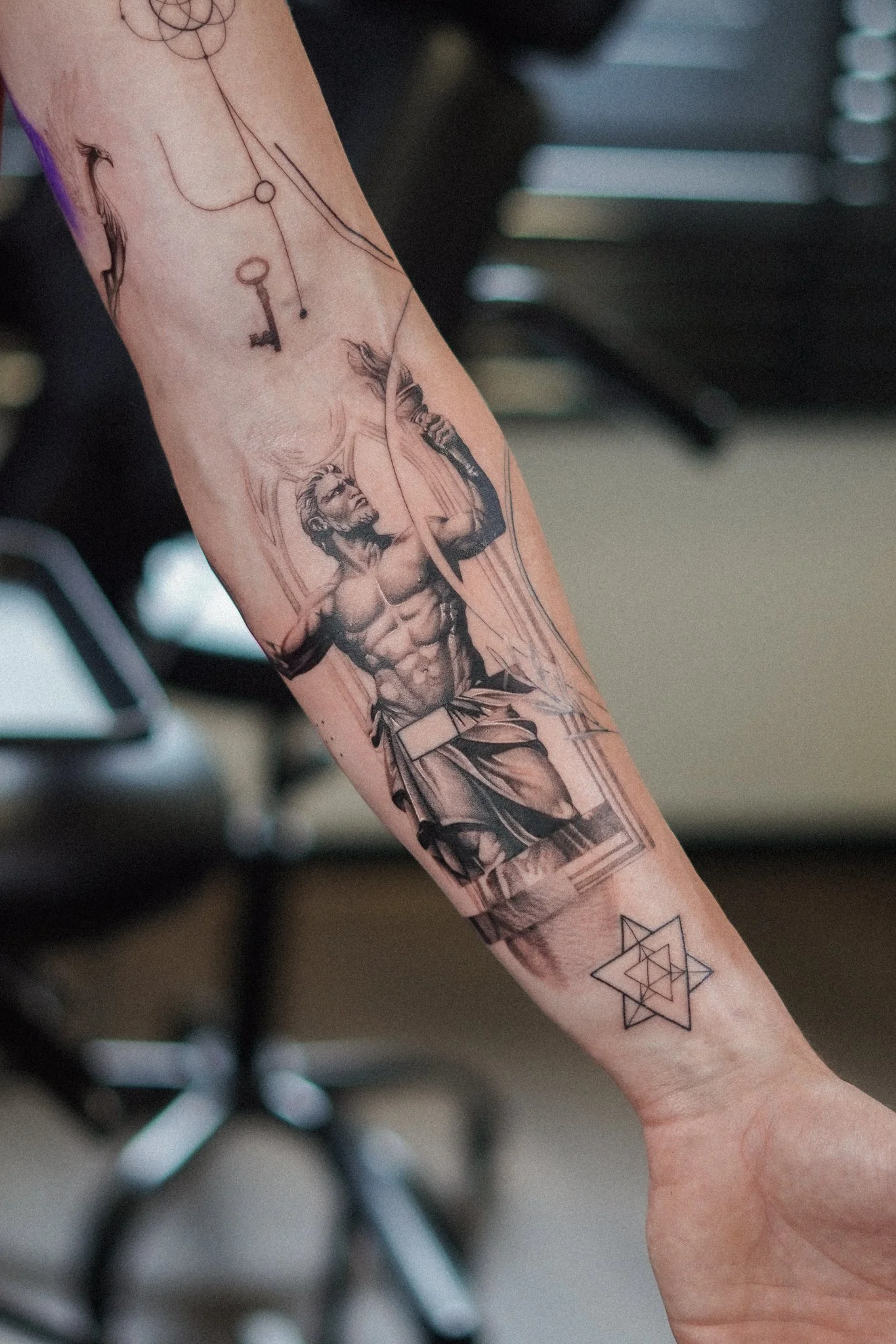 Realistische Prometheus met fakkel en geometrische vormen op onderarm.