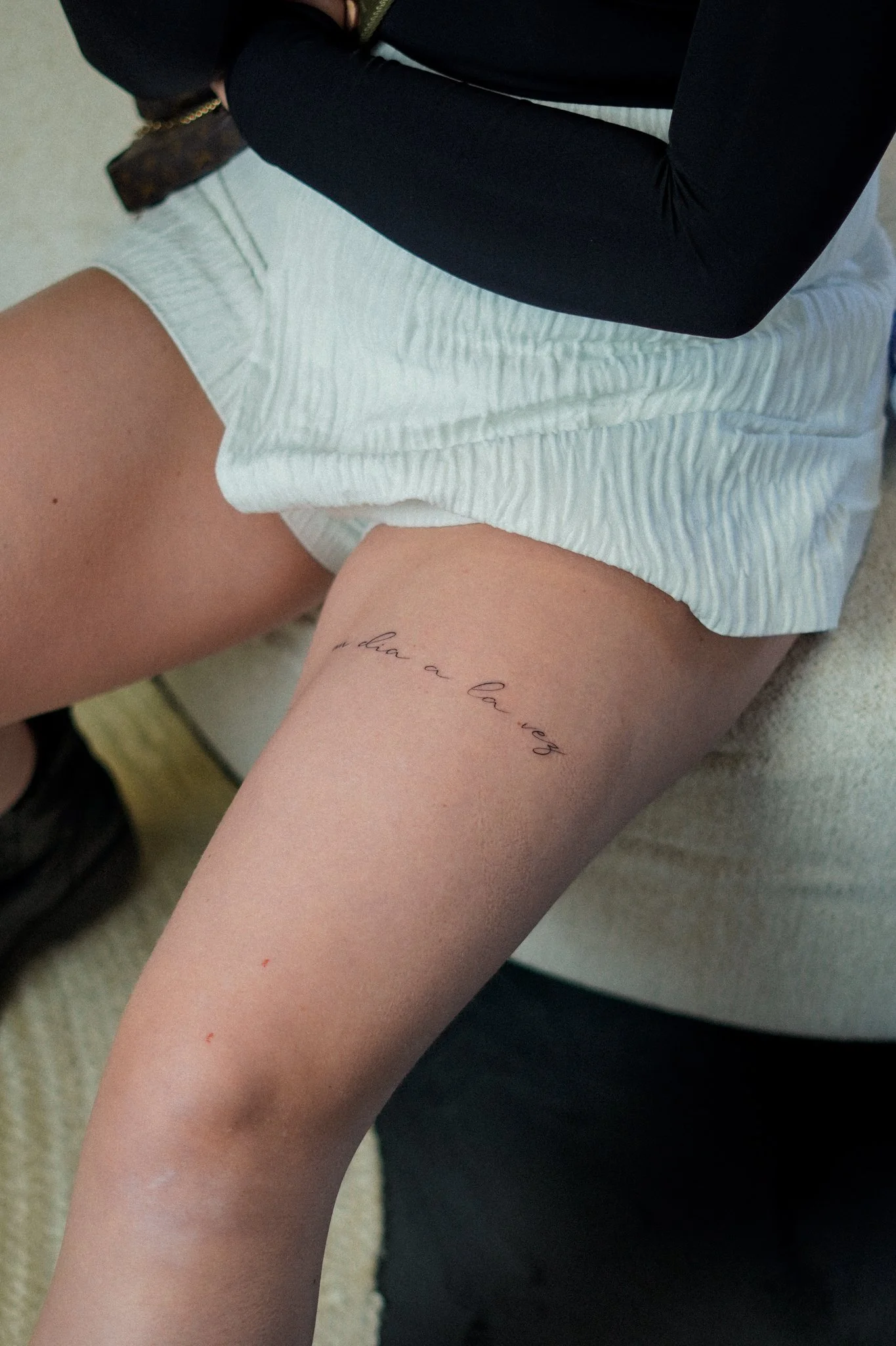 Fineline tekst 'un dia a la vez' op bovenbeen.