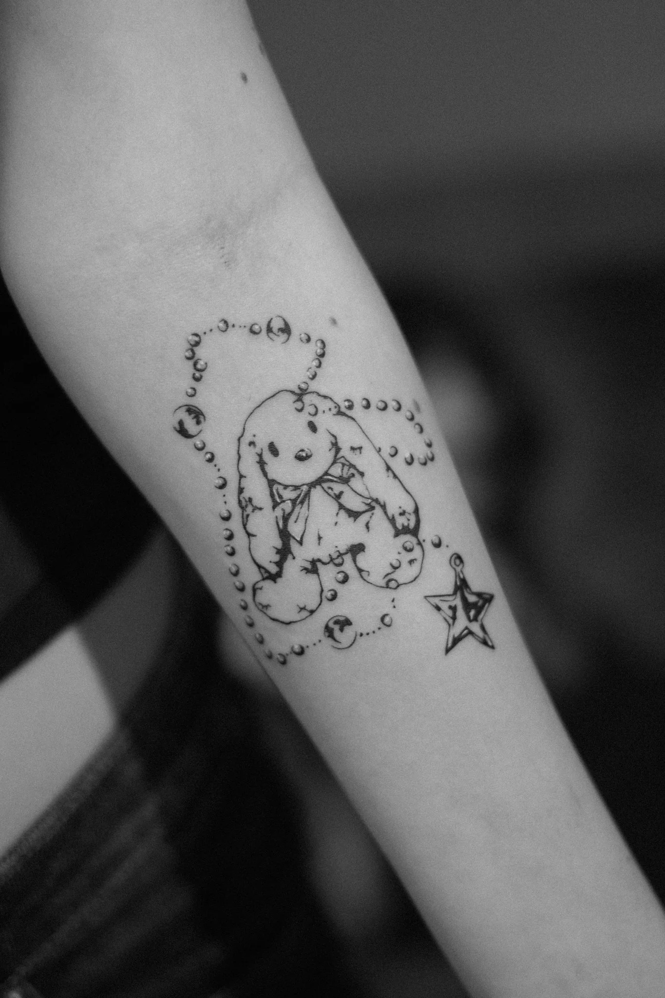 Illustratieve tattoo van een knuffelkonijn met kralenketting en ster.