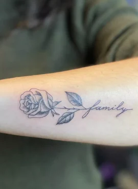 Fineline roos met 'family' tekst als steel op onderarm.