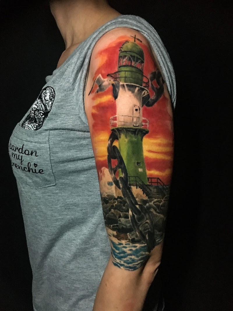 Kleurrijke vuurtoren met anker en meeuw op bovenarm.