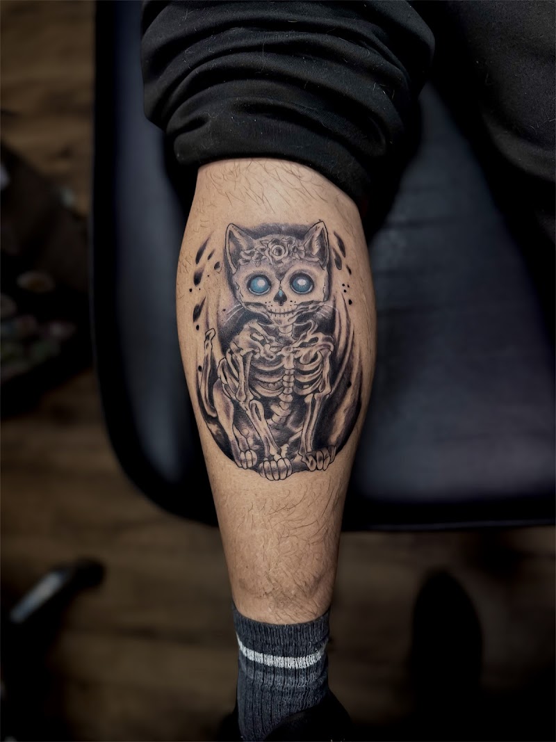 Zwart-grijze kat skelet tattoo met felblauwe ogen op onderbeen.