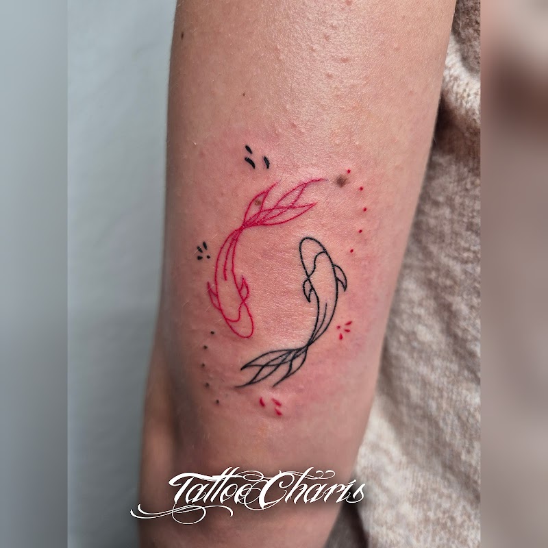 Fineline tattoo van twee koi vissen in yin yang vorm, rood en zwart.