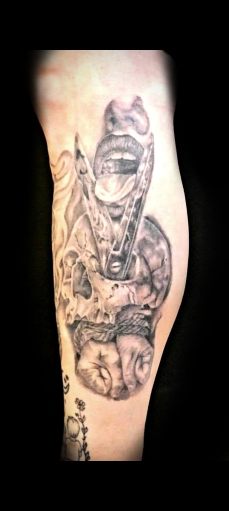 Zwart-wit tattoo van drie rozen met bladeren op de bovenarm.