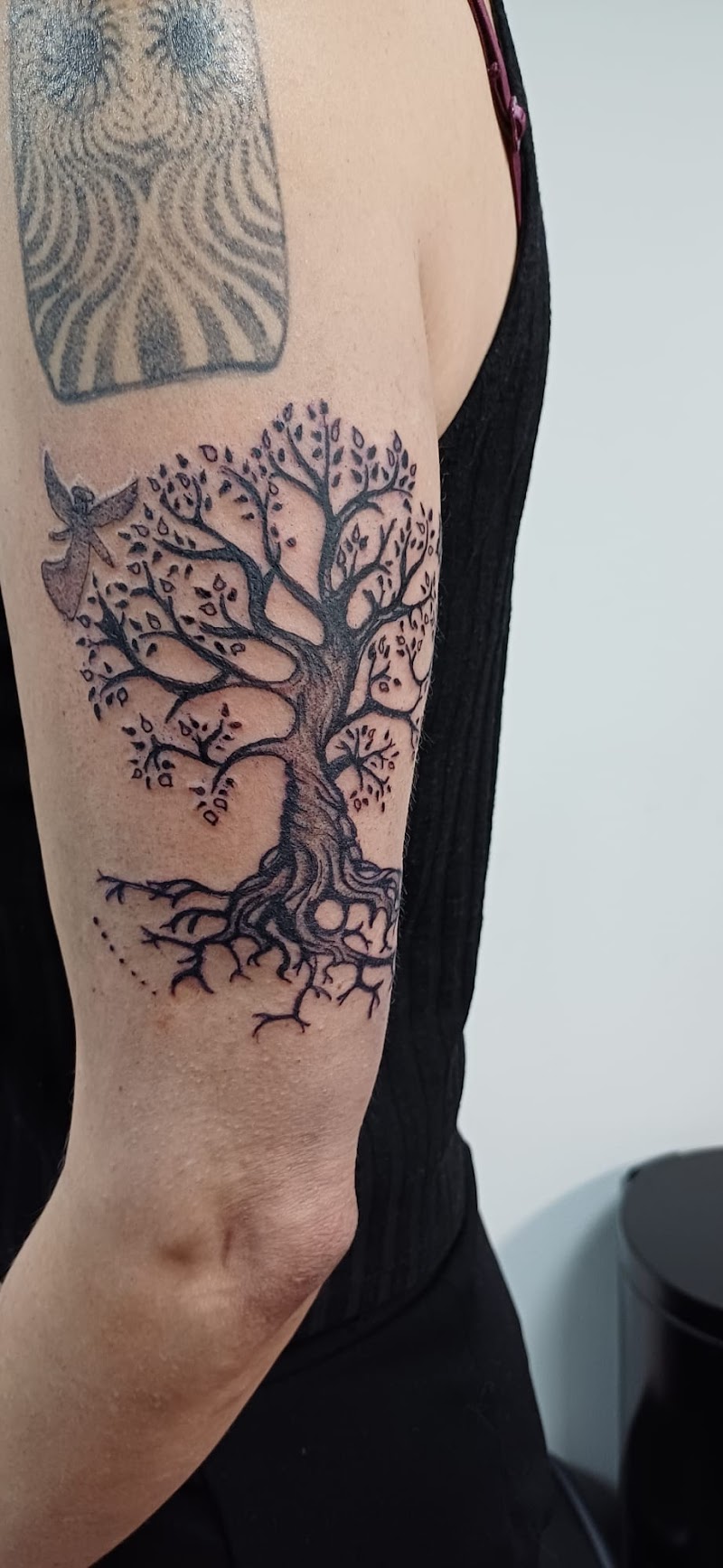 Zwart-wit levensboom met wortels en een kleine engel ernaast op de bovenarm.