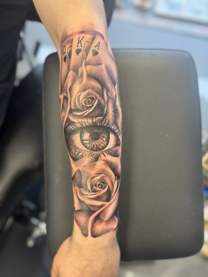 Realistisch oog met rozen en speelkaarten op onderarm.