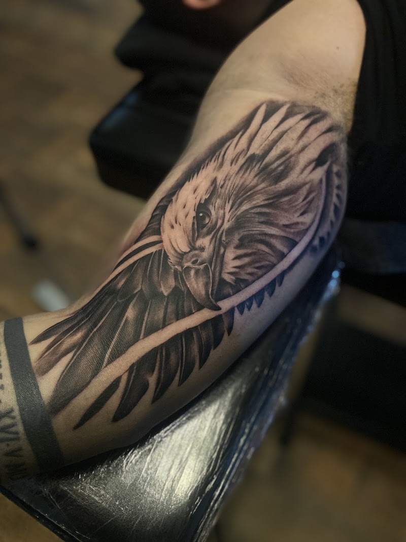 Realistische adelaarskop met vleugel op bovenarm.