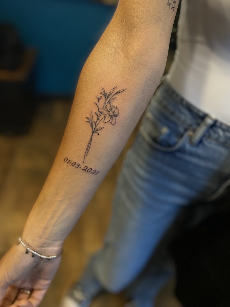 Fineline bloem met datum op onderarm.