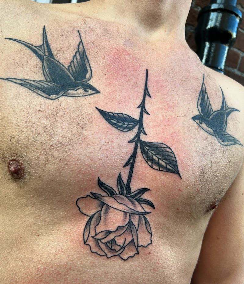 Zwart-wit traditionele roos en twee zwaluwen op borst.