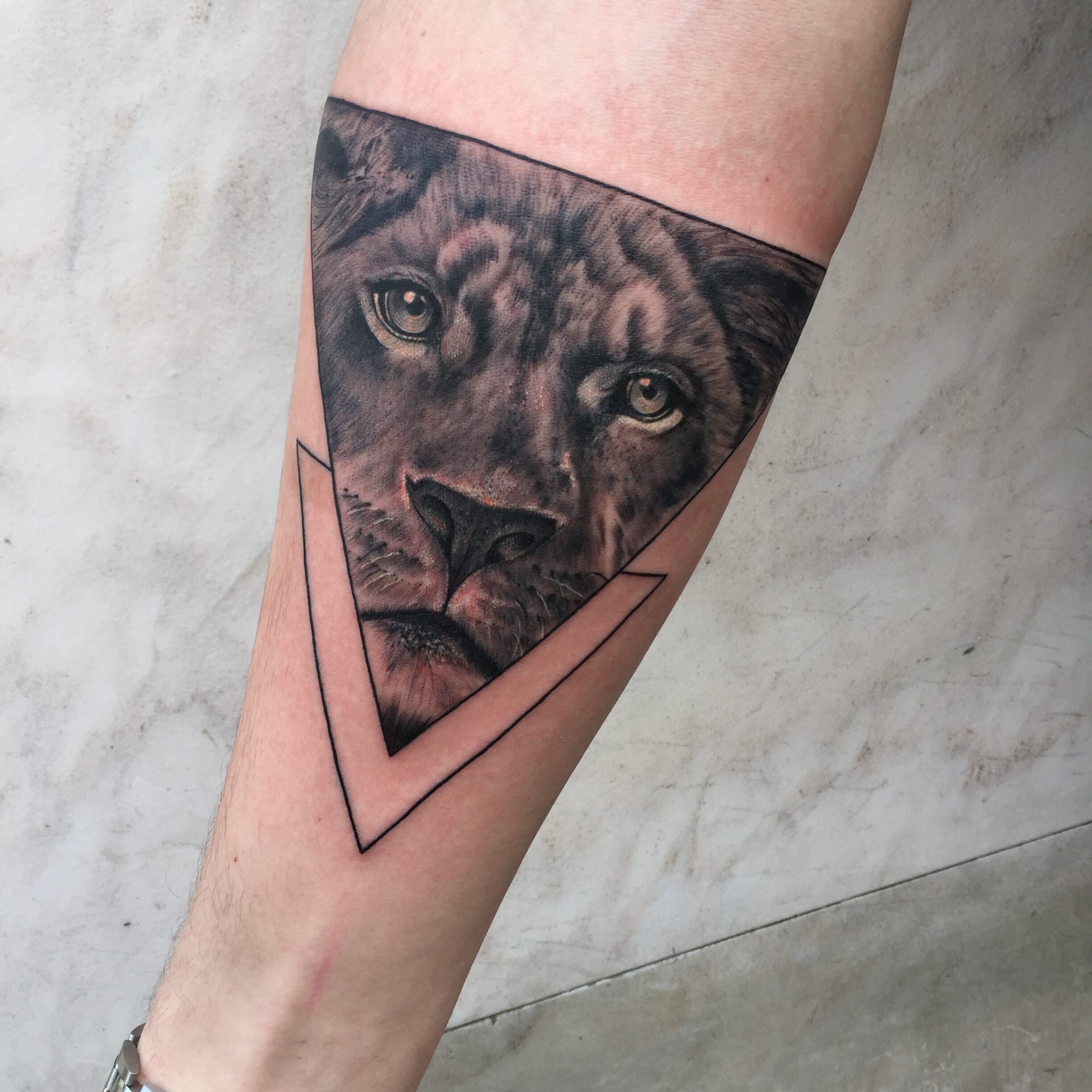 Realistische leeuwin in een geometrische driehoek op de onderarm.